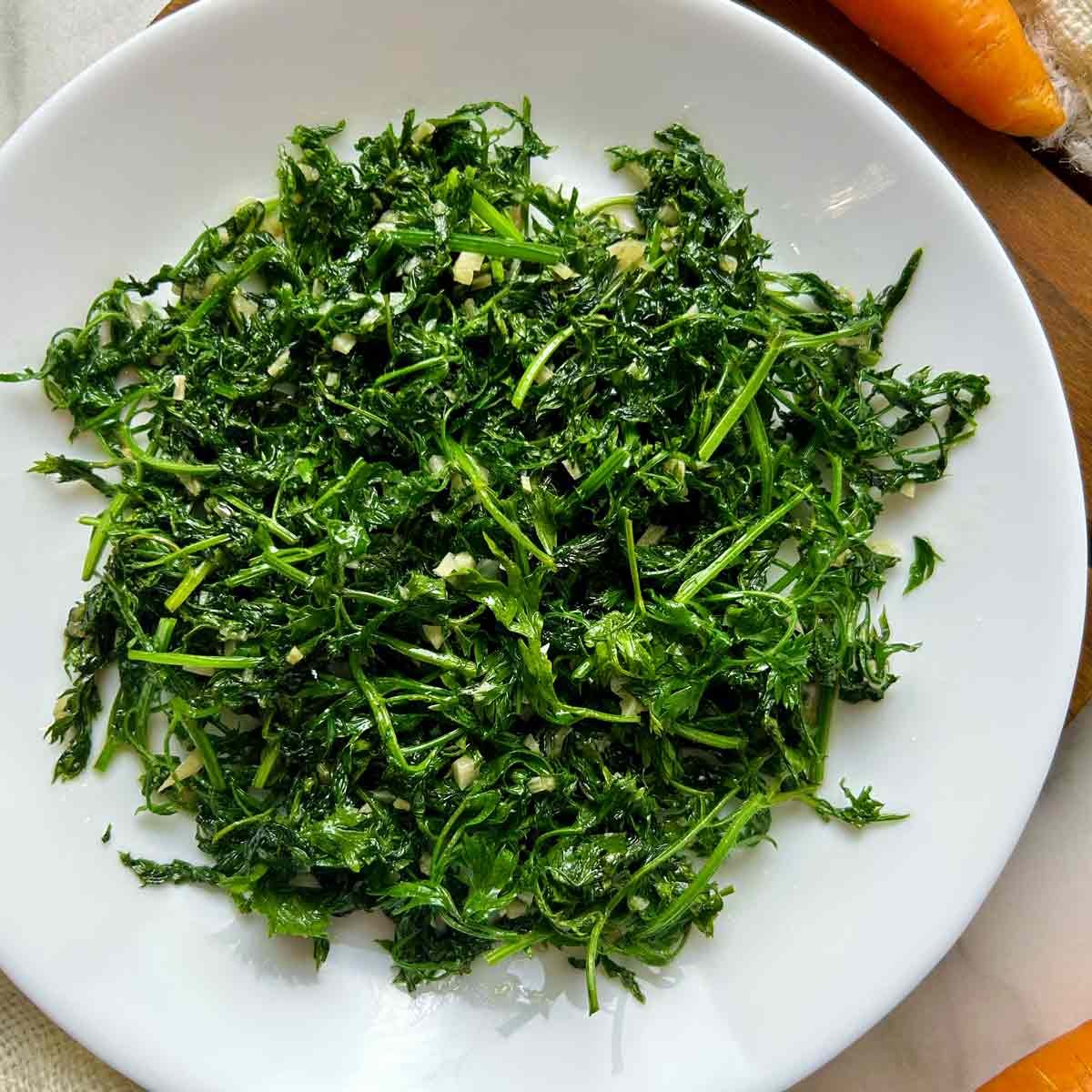 3. Cook the Greens: Add the chopped carrot greens to the skillet. Stir well to coat them with the garlic and oil. Sauté for about 3-5 minutes, or until the greens are wilted and tender.