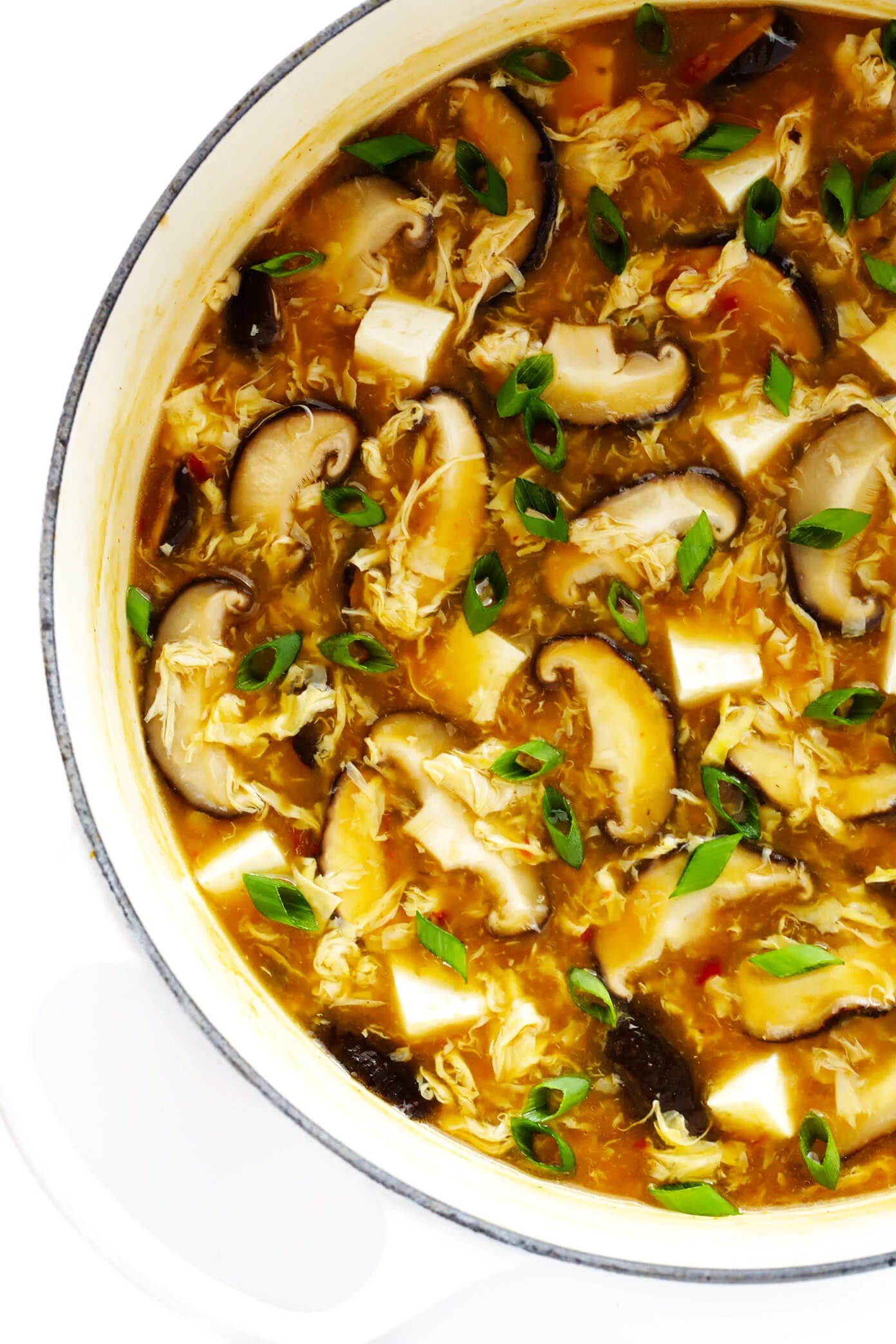 4. Continue stirring the soup in a circular motion, then drizzle in the eggs in a thin stream (while still stirring the soup) to create egg ribbons. Stir in the tofu, half of the green onions, and sesame oil. Then season the soup with salt and a pinch* of white pepper (or black pepper) to taste. If you’d like a more “sour” soup, feel free to add in another tablespoon or two of rice wine vinegar as well. Or if you’d like a spicier soup, add in more chili garlic sauce.