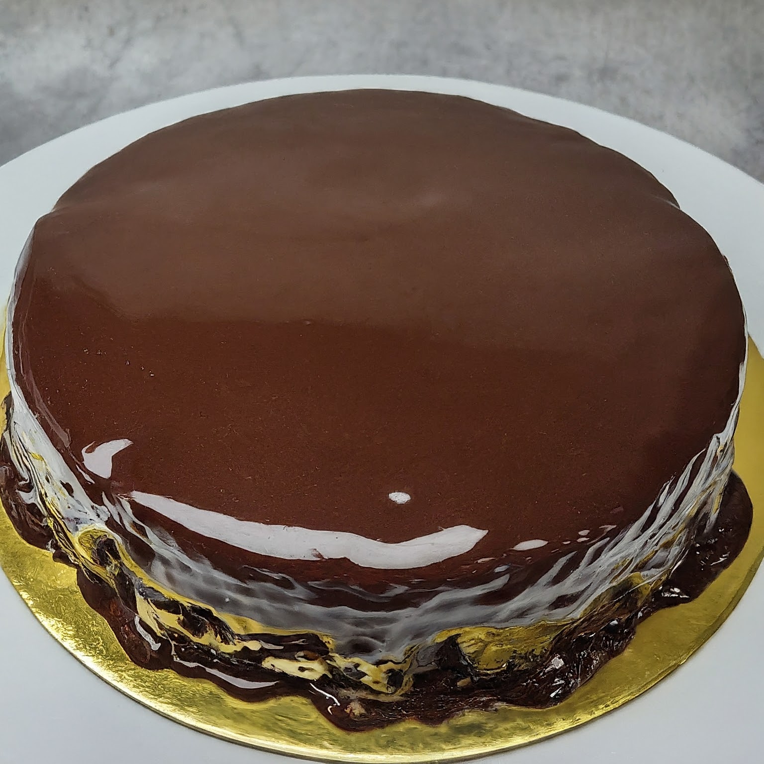 Place one cake layer on a cake plate. Pour enough glaze over the top to completely cover it, allowing the excess to drip down the sides.