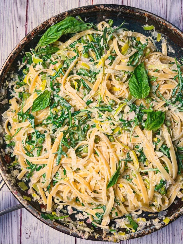 - Add pasta, chives, arugula, peas, and parmesan to the veggie and cream mixture. Toss. Add pasta water to desired consistency (I add it all).