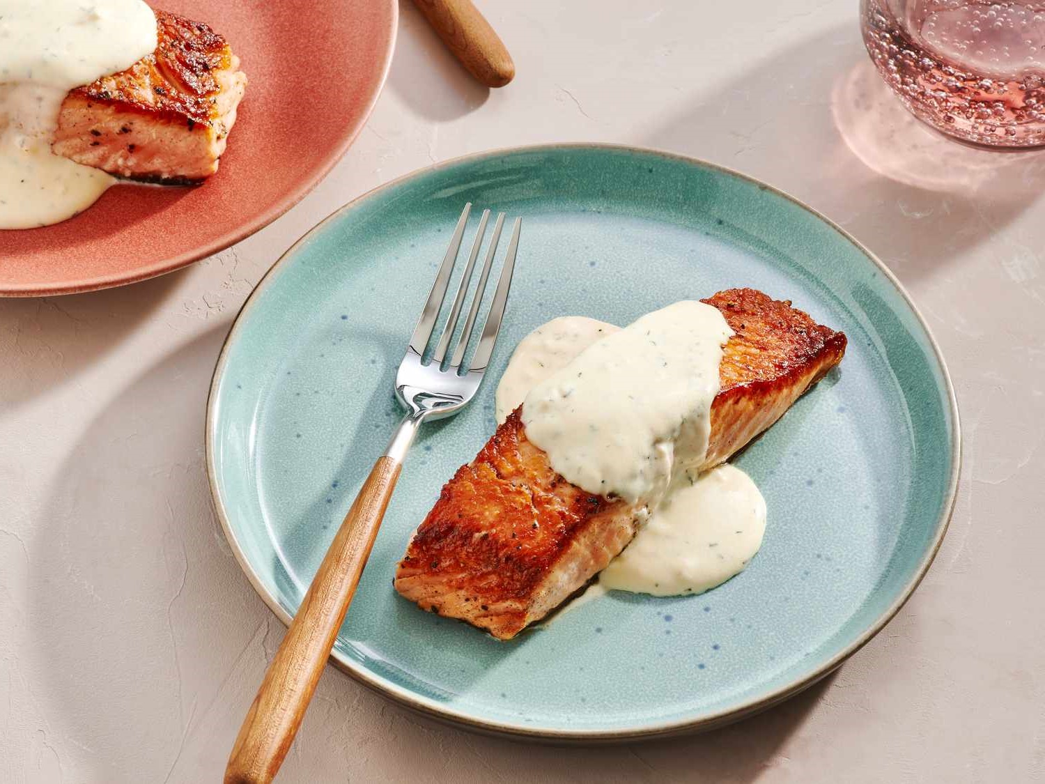 - Serve the lemon cream sauce over the cooked salmon fillets.