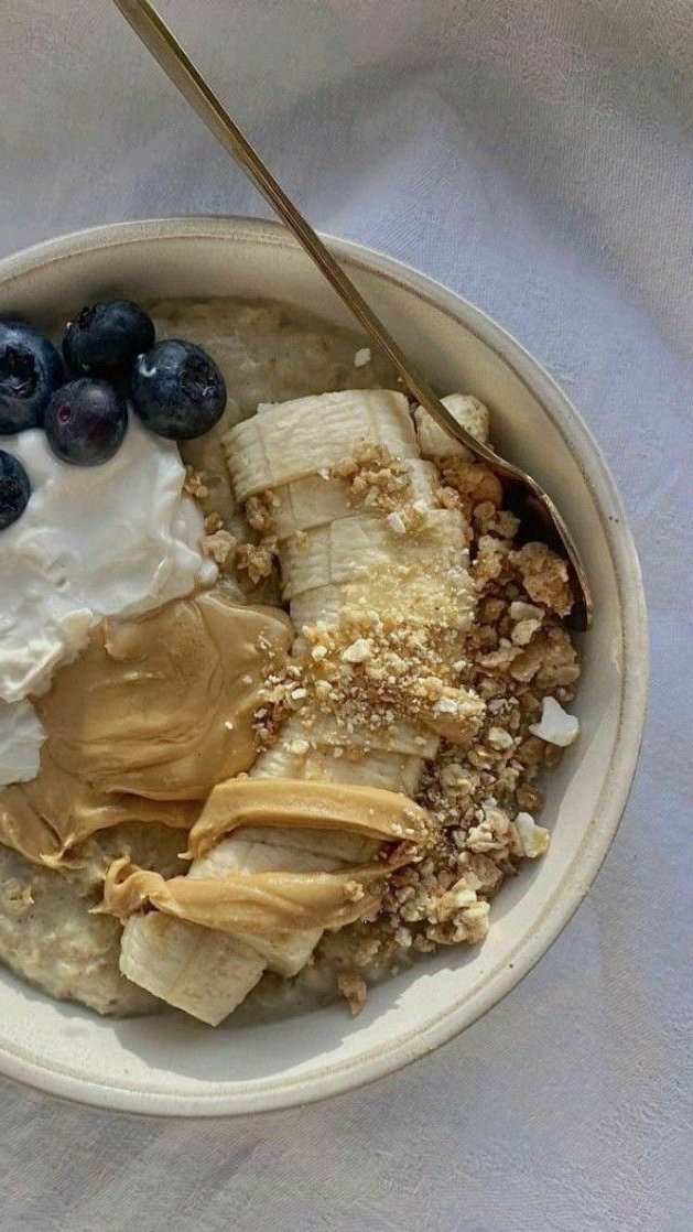 I start my morning with a good breakfast... This oatmeal have banana, peanut butter with granola crumbs, yogurt, and blueberries. it's perfect combination right?