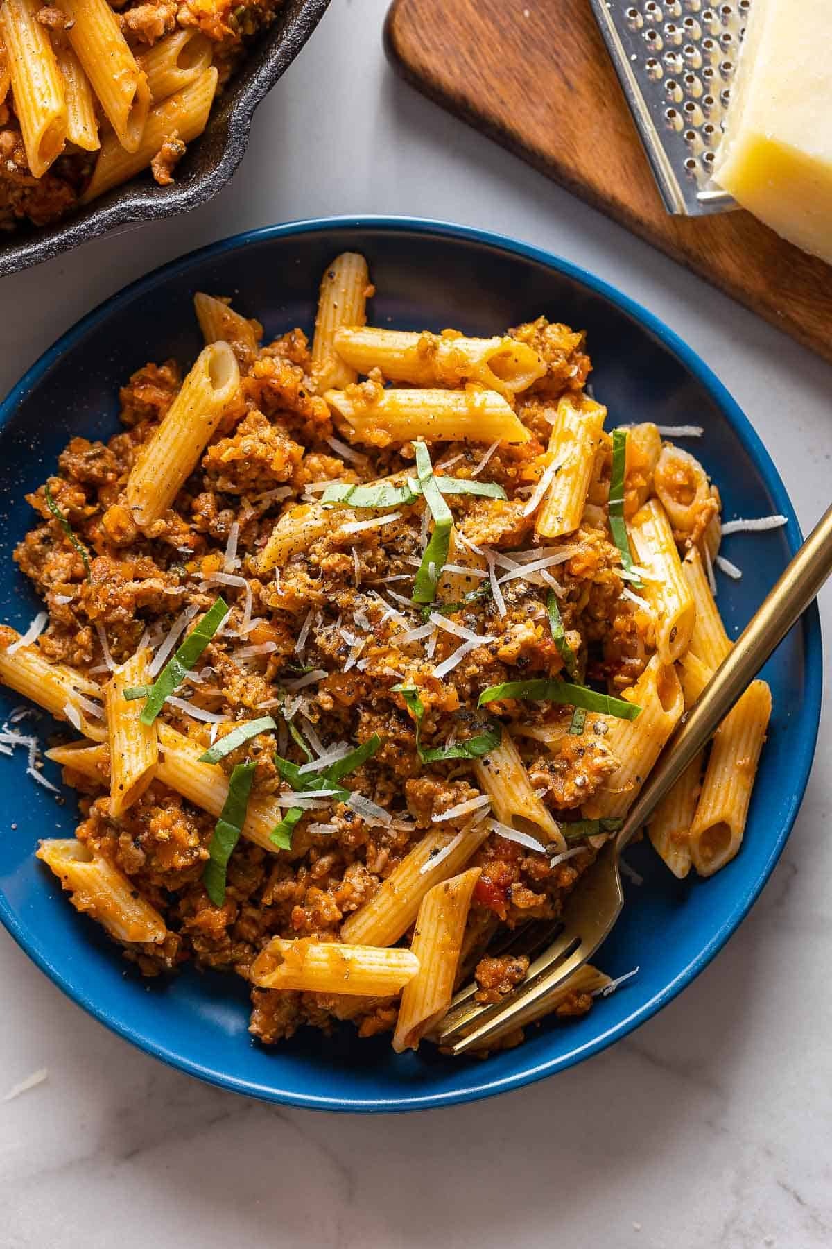 - Prepare the pasta following the instructions on the package. At the same time, in a sizable skillet, cook red pepper and onion with butter and oil until soft. Include garlic and cook for an additional minute. Mix in the pork, tomatoes, broth, cumin, pepper, and salt; warm thoroughly.