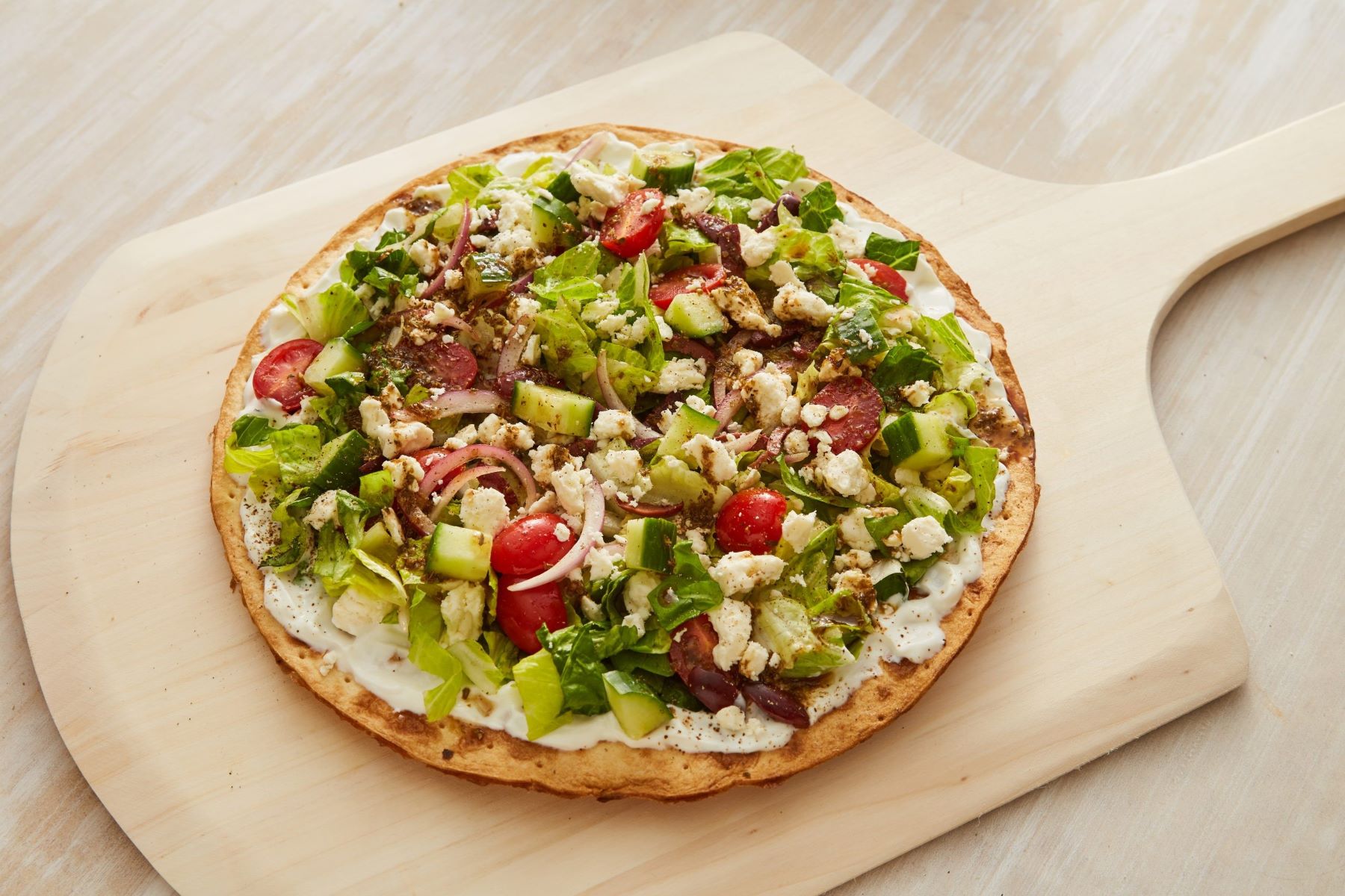 - Slice the salad pizza into portions and serve immediately, while the crust is still warm and crispy.